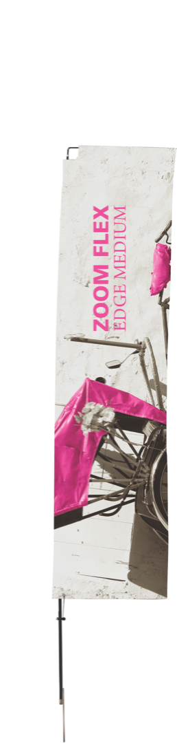 The Zoom Flex Small Flag features a full fiber pole and wind-resistant flag offered in several shapes. For indoor or outdoor use, the flexible design allows the graphic to rotate in the wind. The Zoom Flex Small Flag comes in your choice of four shapes - Feather, Straight, Teardrop and Edge. Heights vary based on flag shape. Ground stake and storage bag included. Product not designed to withstand adverse weather or high wind. Weather damage is not covered by product warranty.